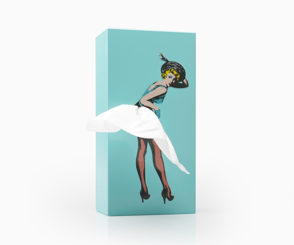 Every time you pull a tissue, the lady’s skirt restyles itself like catching a gentle breeze. The “skirt tissue holder”, featuring resin-embossed pop art print, four anti-slip pads, a slidable inner case for tissue storage, and a metal-weighted base. The specially designed 3D contour inside the holder naturally guides the tissue into a skirt shape with every pull.