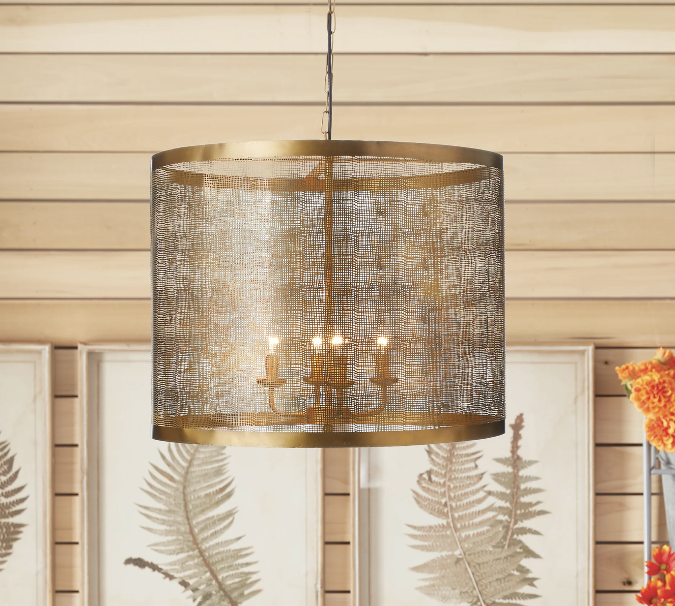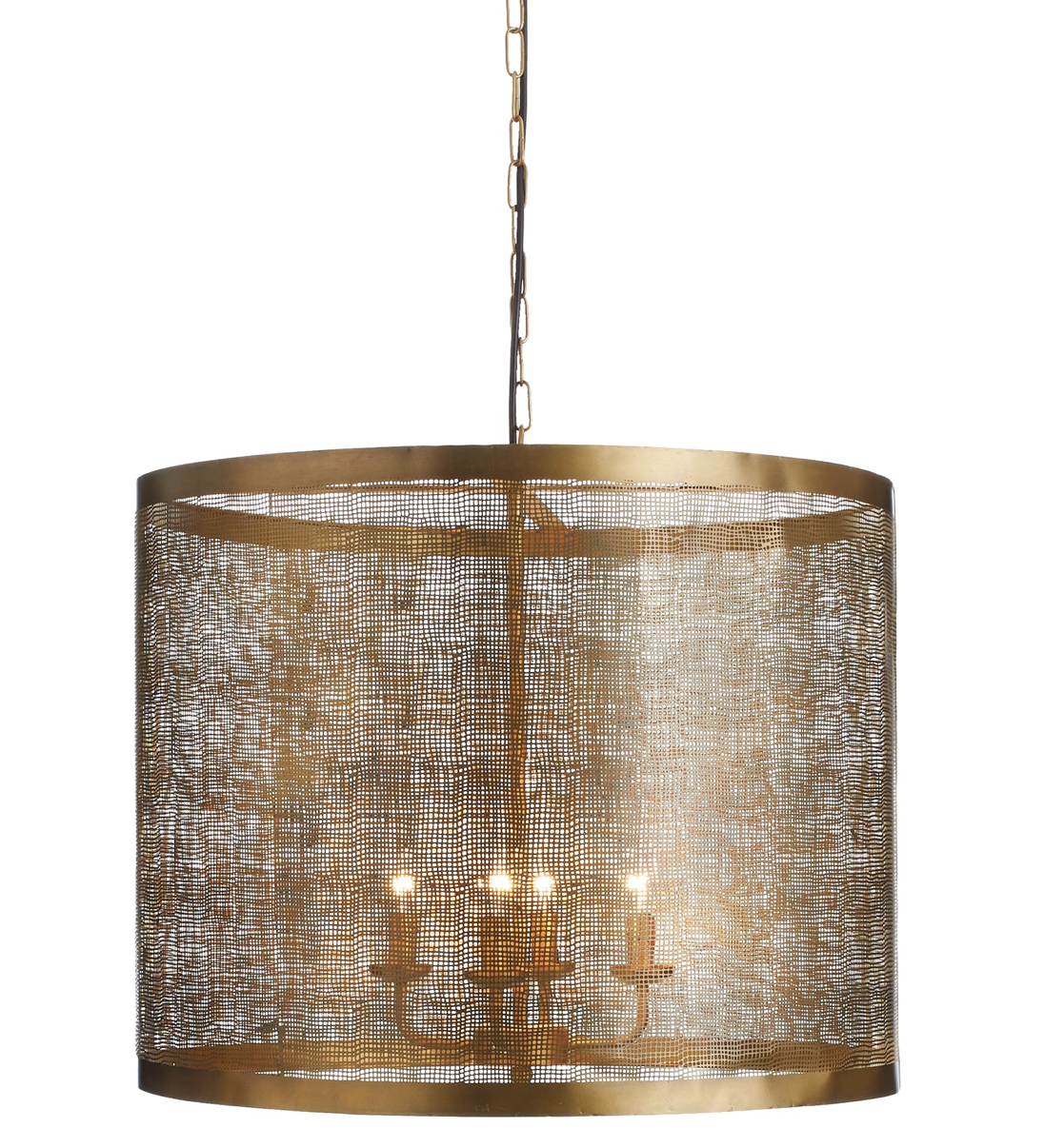 With an over scaled drum and patterned mesh detail, this pendant steals the show. Use above the kitchen table or illuminate the entry foyer, either way a stunner. 24 x 24 x 18.5